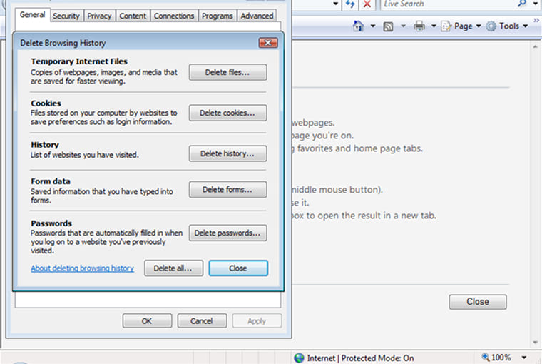Alternatively, you can use the keyboard shortcut CTRL+SHIFT+DEL to directly navigate to the Internet Options dialogue